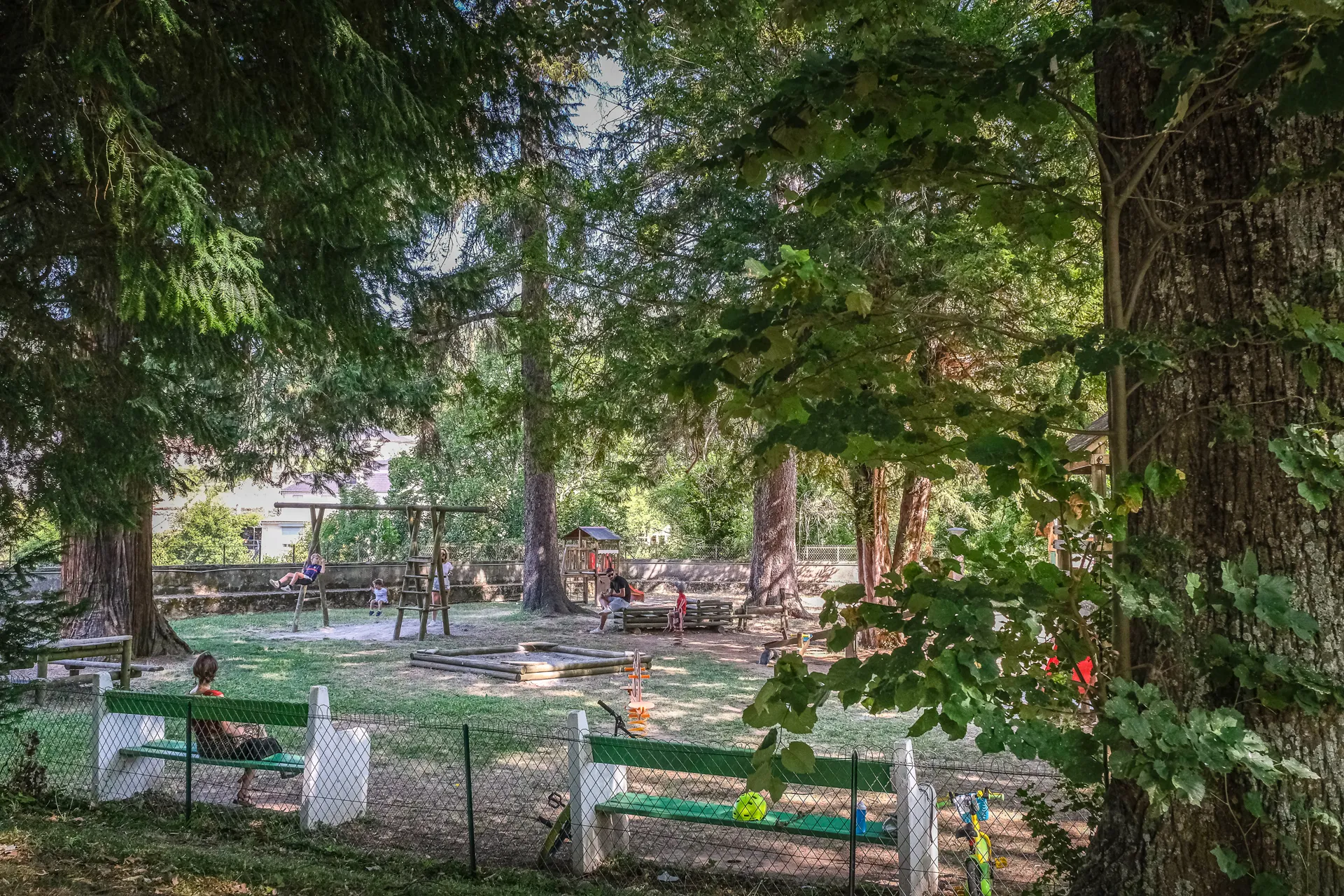 Nichée sous les grands arbres du parc, cette aire de jeux ombragée est un véritable havre de détente pour les familles.